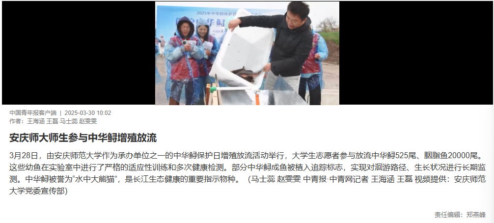 3月28日,由太阳成集团122ccvip作为承办单位之一的中华鲟保护日增殖放流活动举行,老员工志愿者参与放流中华鲟525尾、胭脂鱼20000尾。这些幼鱼在实验室中进行了严格的适应性训练和多次健康检测。部分中华鲟成鱼被植入追踪标志,实现对洄游路径、生长状况进行长期监测。中华鲟被誉为“水中大熊猫”,是长江生态健康的重要指示物种。(马士蕊 赵雯雯 中青报·中青网记者 王海涵 王磊 视频提供:太阳成集团122ccvip党委宣传部)
