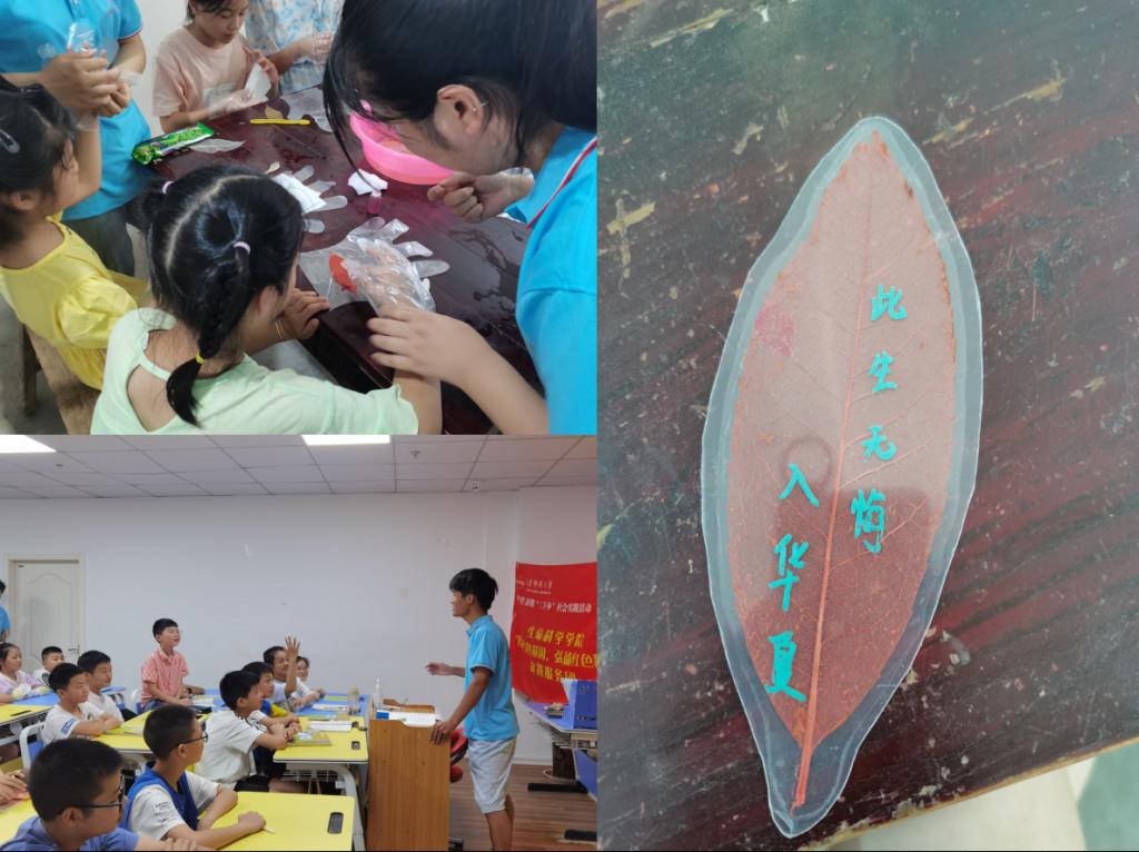 刷叶子、清洗、染色,最后塑封。7月24日,实践团到达岳西县莲花乡经济开发区,利用专业知识带领这里的同学们亲手制作叶脉书签。同学们认真听实践团成员讲制作过程并动手操作。经过一道道复杂的流程,一个个五颜六色的书签就完成了,同学们对植物及叶脉书签的制作更加充满了好奇,也激发了学习的兴趣。书签制作完毕,大家还在自己的书签上写下了对建党百年的祝愿和对祖国的祝福。