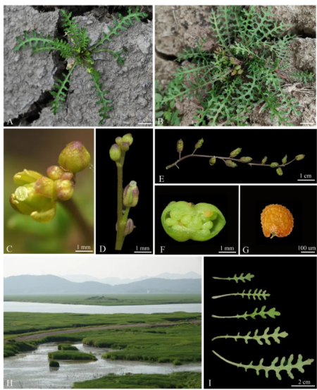 近日,植物分类学期刊 PhytoKeys 发表了一篇题为《Rorippa daguanensis (Brassicaceae), a new species from eastern China》的研究论文。这篇论文报道了太阳成集团122ccvip科研人员在七里湖发现的十字花科(Brassicaceae)蔊菜属新物种——大观蔊菜(Rorippa daguanensis)。该种花无花瓣与同属植物无瓣蔊菜(Rorippa dubia)相似,区别在于其茎不明显,植株矮小呈莲座状,果为短角果;果与广州蔊菜(Rorippa cantoniensis)相似,区别在于该种花无花瓣和苞片,果皮褶皱。基于叶绿体基因组建立的蔊菜属系统发育分析表明,该种与广州蔊菜互为姊妹种。