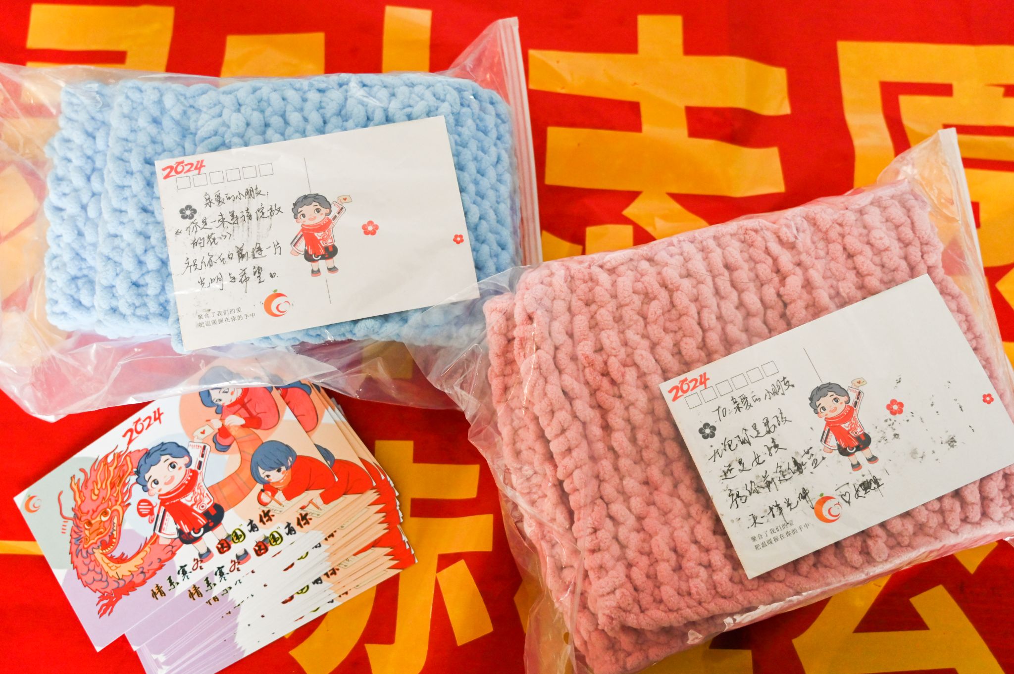 生物科学专业2023(2)班的赵慧欣因为担心自己第一条围巾织得不够好看、不合格,便利用每天晚上下课后的时间,抽空请教自己的妈妈,重新织了第二条围巾。她把两条围巾放在一起,在卡片上写到:“不好意思啊小朋友,姐姐这条围巾织得不太好看,但是是姐姐一针一线用心织出来的,希望你能收下姐姐的这份心意。”