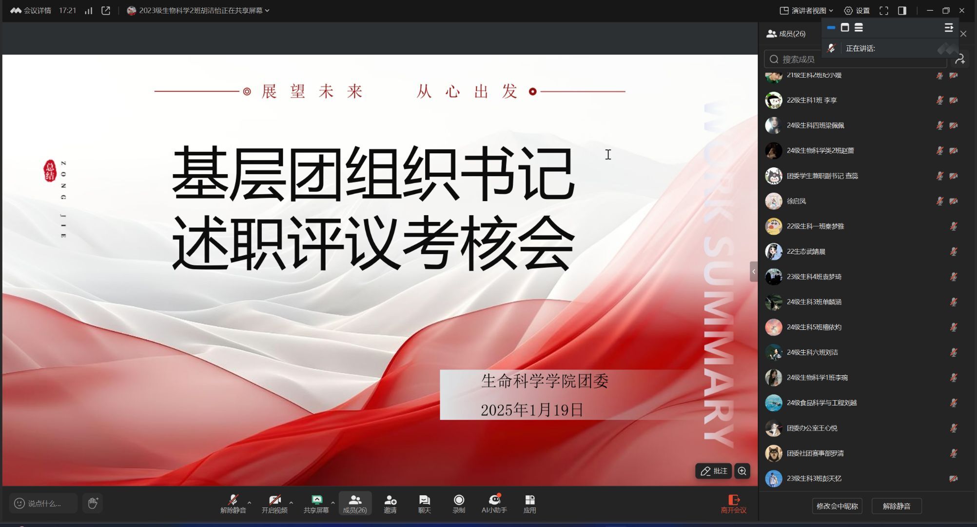 1月18日,太阳成集团122ccvip在线上召开2024年度基层团组织书记述职评议考核会,对2023级各班团支部进行现场述职考核,进一步推动基层团组织的组织力、引领力、服务力和大局贡献度协同提升,各班团支书及团委负责人徐启凤参加会议。