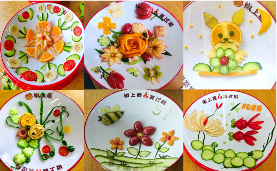在水果拼盘设计环节中,15组参赛选手各显神通。比赛现场,有的团队以“游龙舟”为主题,将黄瓜切成小片作鳞片,拼接成龙身,黄瓜雕出龙头,苹果切成小船;有的团队打造出“熊猫攀竹”,用黄瓜巧妙雕出竹竿,苹果片和黄瓜皮垒出小熊猫……不同的水果拼盘作品在员工们手中诞生。