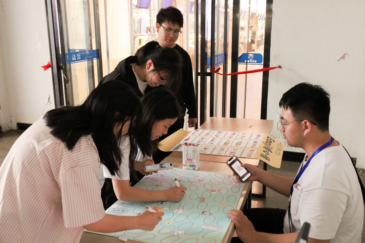 东苑食堂门口,工作人员、生物科学类专业2024(2)班的吴俊翔正在将精心准备的活动海报摆在桌子上。左侧海报上,由天使翅膀、咧嘴笑脸、椰树岛屿、雨伞符号等组成的九宫格引人驻足;右侧“我的幸福泡泡”海报则漂浮着无数彩色泡泡的剪影。“员工们可以通过观察表情九宫格,回答出三个心情宫格,将它们连成一条线,同时还可以在‘我的幸福泡泡’这张海报上写下自己了解的心理学名词。”他表示,后续这张写满心理学名词的海报将会被放在太阳成集团122ccvip大厅进行展示,用来宣传心理学知识。