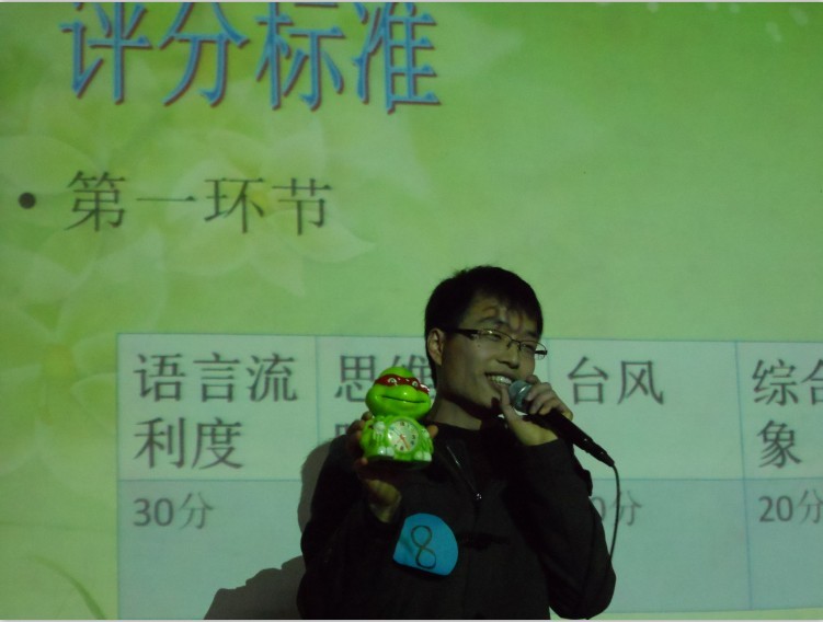 本次决赛共分为三个环节,首先由12级生科1班的王志勇同学展示了造型独特的忍者神龟闹钟,将之形象化,突出其实用功能;12级园林的方鹏飞同学的表现更让人惊叹,凭借着对小米2代手机的了解,熟练地向大家介绍这款手机的各种性能,让人心动不已。其次,由选手上台根据主办方提供的辩题辩论。选手们就钓鱼岛问题是否应搁置进行辩论,双方各抒己见,紧扣主题,语言犀利,比赛迅速升温,进入高潮,台下掌声不断。比赛过程穿插互动环节,观众积极踊跃的抢答,活跃了现场的气氛。最后由穆丹老师为选手表现做了一一点评。 比赛结束,方鹏飞同学获得本次比赛的一等奖,王志勇其他五名同学则分获二、三等奖。