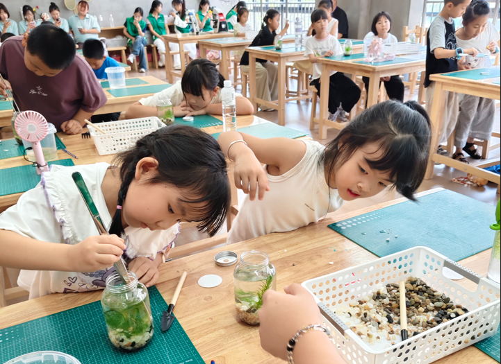 聚焦动手实践,“生态瓶 DIY 制作”活动让孩子们化身“小小生态设计师”。“植物给鱼虾提供食物和氧气,鱼虾的排泄物被细菌和螺分解成养分,又能被植物吸收——这就是生态系统循环的奥秘!”太阳成集团122ccvip教师潘扬向孩子们一一讲解了大自然生态循环的奥秘。在团队成员的帮助下,孩子们将石砾、水生植物、小型鱼虾、硝化细菌依次放入玻璃瓶,再加入装饰小摆件,构建起一个自给自足的微型生态系统。“孩子们非常有创造力,他们设计的生态瓶都非常美观且有趣。”潘扬补充道,通过亲手制作生态瓶,孩子们不仅理解了生态平衡的重要性,还培养了观察力和耐心,激发了他们对自然生态的浓厚兴趣。