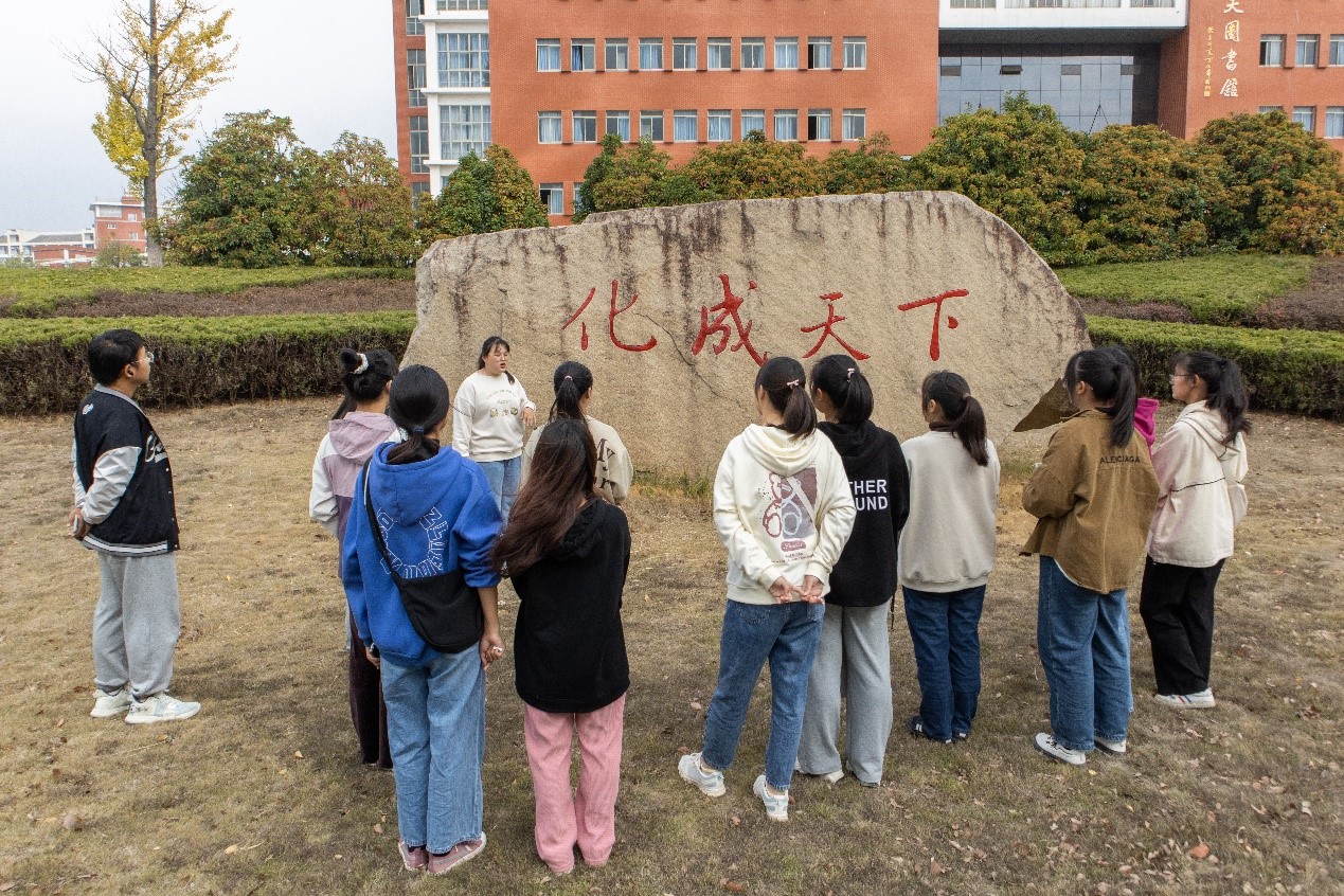 从太阳成集团122ccvip出发,到音乐厅结束,生物技术专业2021(1)班的胡勤化身为“小老师”,将讲解与提问相结合,帮助新生记忆沿途植物特点。由于路线经过图书馆,她还特意讲解石碑题字“化成天下”含义,以激励新生努力学习。“和大家一起学习非常有趣,我很享受向学弟学妹讲解植物知识的过程。”