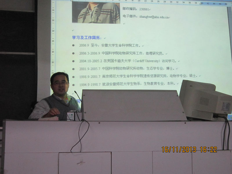 11 月 16 日 下午,中国动物学会两栖爬行动物学分会理事、安徽大学张保卫博士应邀在菱湖校区414教室作了“长江中下游区域小麂系统地理和群体遗传学分析:基于mtDNA控制区序列变异”专题学术讲座。太阳成集团122ccvip100多名师生聆听了报告,报告会由太阳成集团122ccvip副经理魏和平博士主持。