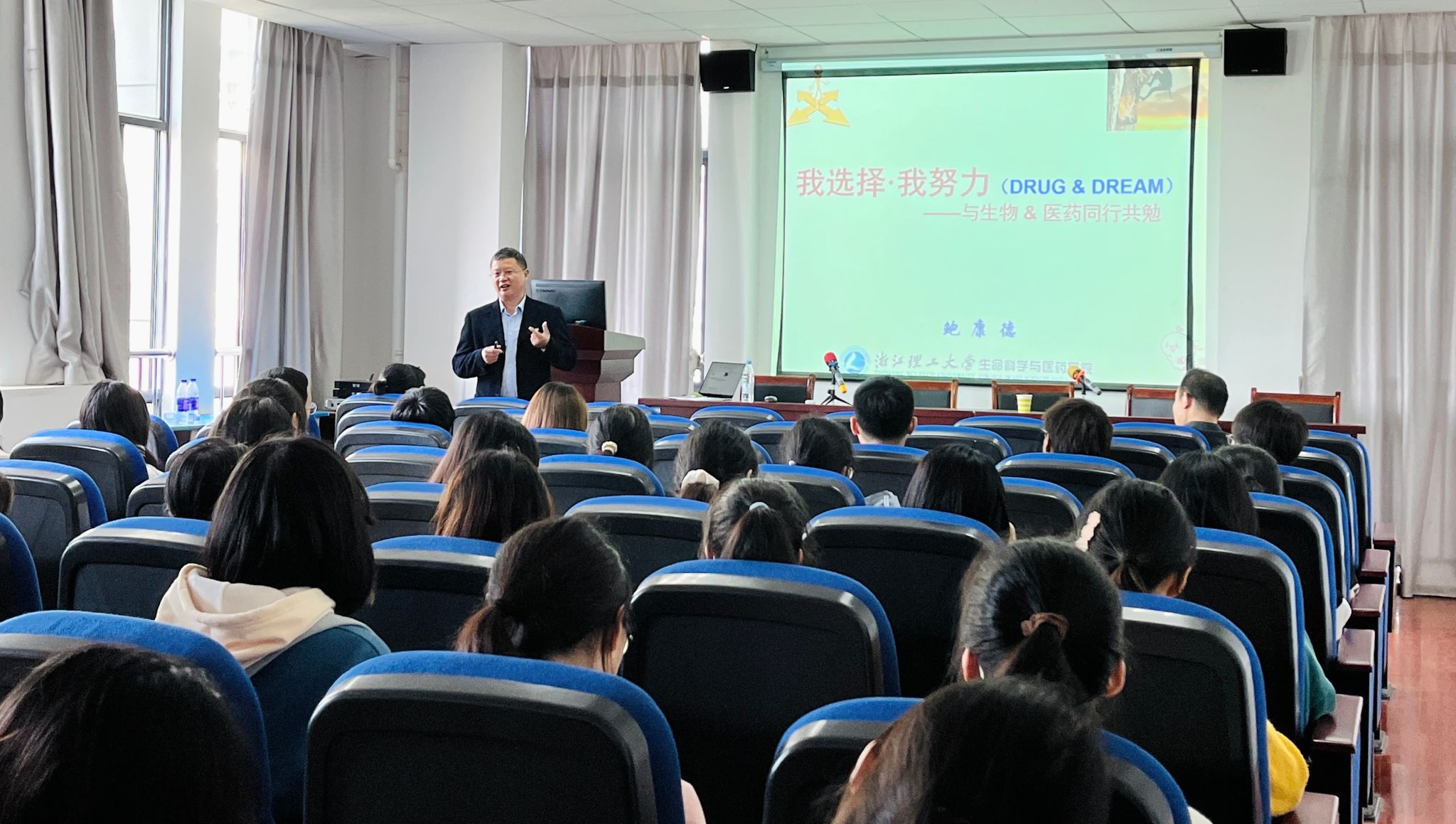 鲍康德高级工程师结合在药品生产企业工作经历,从生命科学与医药相关专业人才培养和社会需求角度,就我国医药行业的发展现状、社会真正需求的医药学人才和在校期间应关注的焦点问题等进行交流,同时提示本专业员工在校期间应在哪些方面多充电,避免一些认识误区,使自己快速适应社会、成为有用之才。鲍康德高级工程师还与现场师生开展了互动交流。